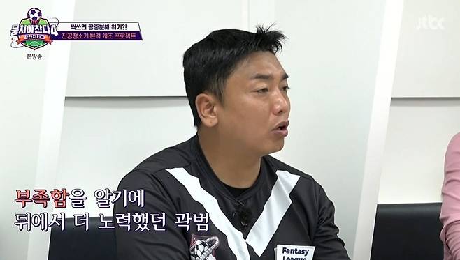 곽범은 "이 팀에서 내가 제일 부족한 것 같은데, 억울해서 눈물이 나려고 한다"라고 말문을 열었다. 곽범은 "계속 지다 보면 우리는 지는 DNA만 생기는 거다. 난 부족하지만, 그래서 일주일에 두 번 이상 레슨받으려고 하고, 바빠도 시간 나서 새벽에라도 나가려고 한다"라며 "난 선발로 뛰고 싶어서 그렇게 열심히 하는데, 이미 기회를 얻었다는 생각 때문에 절실함이 안 보이는 것 같다"라며 팀원들이 더 간절하게 했으면 하는 바람을 전했다.