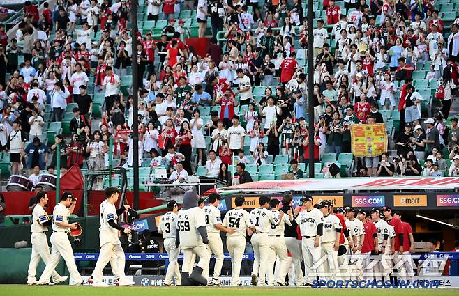 29일 인천SSG랜더스필드에서 열린 한화와 SSG의 경기, SSG가 2대0으로 승리했다. 승리의 기쁨을 나누는 선수들의 모습. 인천=허상욱 기자wook@sportschosun.com/2025.06.29/