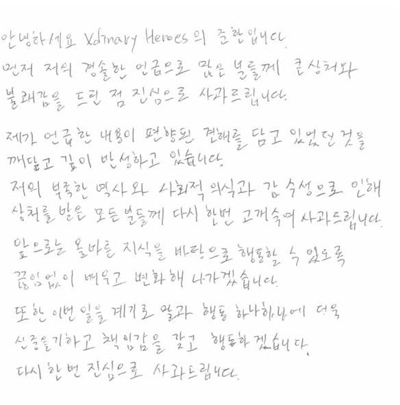이어 "제가 언급한 내용이 편향된 견해를 담고 있었던 것을 깨닫고 깊이 반성하고 있다"며 "저의 부족한 역사, 사회적 의식과 감수성으로 인해 상처받은 분들, 불쾌함을 느끼신 모든 분께 다시 한번 고개 숙여 사과드린다"고 고개 숙였다.