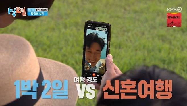 이후 김종민이 '옥탑방 문제아들'에서 획득한 커피차가 도착했다. 김종민은 영상으로 "마음은 다 주고 싶지만, 3명 주면 되나?"라고 밝혔다. 이에 게임으로 음료 마실 3명을 선발했다. 그러던 중 김종민에게 영상통화가 왔고, "지금 프랑스 앙티브다"라고 밝혔다. 딘딘이 "일정 타이트해? '1박'과 신혼여행 중 뭐가 빡세냐"라고 묻자 김종민은 "타이트하다. 여기"라며 속삭였다. 이어 김종민은 "그래도 행복하지?"란 질문에 "행복해"라면서 "시청률 떨어뜨리지 말고 열심히 해라"라고 당부했다.