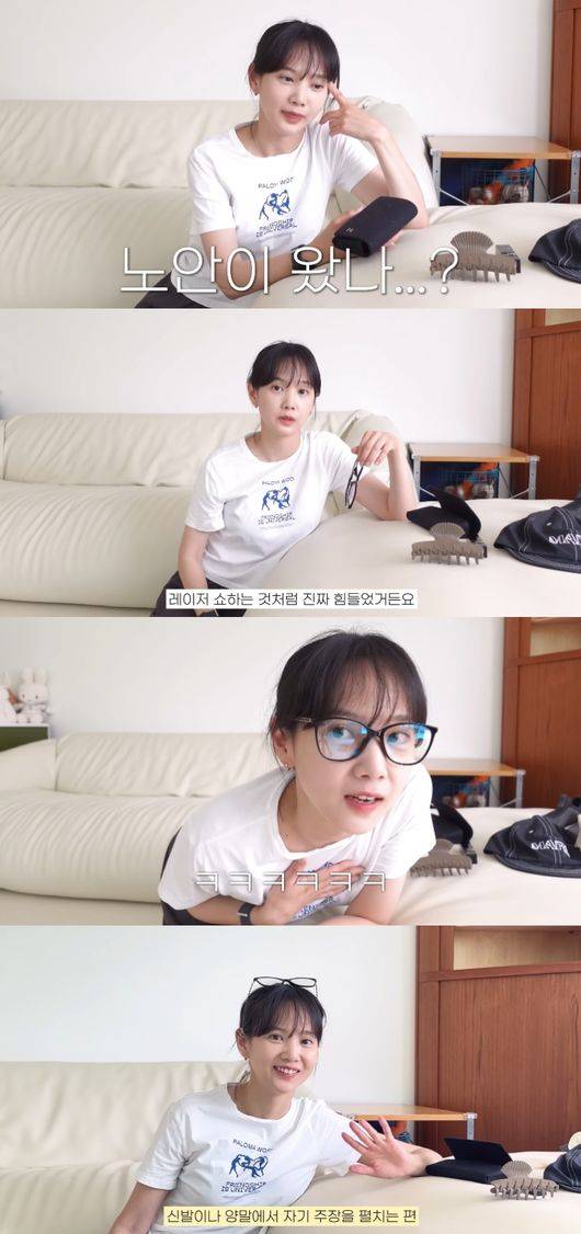 윤승아는 "눈이 자꾸 침침할 일이 많아지더라. 노안이 왔나?"라며 "지인들끼리 만나며 가끔 제 눈이 침침할 때 '혹시 너도 침침하니?'라고 물어본다. 그래서 블루라이트 차단되는 안경들을 찾아서 쓰기 시작했다. 제가 원래 눈 자체가 동공이 더 큰 편이라 빛 번짐이 좀 심하다고 하더라"라고 씁쓸해했다.