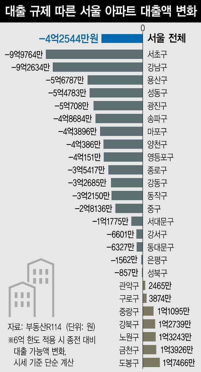 이번 조처로 주택담보대출 여신한도가 6억원으로 제한되면서 서울 전체 25개 구 가운데 18개 구에서 대출액이 종전보다 줄어들게 됐다. 부동산R114 조사를 보면, 현 시세 기준으로 6억원 한도 규정을 넘지 않고 주택담보인정비율(LTV) 70%까지 대출이 가능한 서울 자치구는 ‘노도강’(노원·도봉·강북구), ‘금관구’(금천·관악·구로구)와 중랑구 등 7개 구뿐이다. 이들 지역은 아파트 평균 시세가 6억~8억원대로, 엘티브이를 최대 70%까지 적용받아도 6억원 이하다.