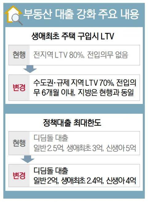 특히 이번 대책에서는 신혼부부 등 이른바 실수요자를 대상으로 한 정책대출도 대폭 강화된 점이 눈길을 끈다. 생애최초 주택을 구입하는 경우 주택담보대출비율이 기존 80%에서 70%로 축소되고, 6개월 이내 반드시 전입해야 한다는 조항도 신설됐다. 서민들이 주로 이용하는 디딤돌(구입) 대출이나 보금자리론 등 다른 정책대출도 해당 규제를 적용 받는다.