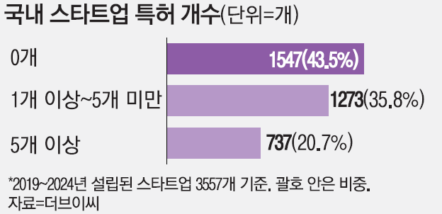 29일 벤처투자정보 플랫폼 더브이씨에 따르면 2019년부터 지난해까지 설립된 국내 스타트업 3557곳 중 43.5%에 달하는 1547곳이 특허가 단 1개도 없었다.