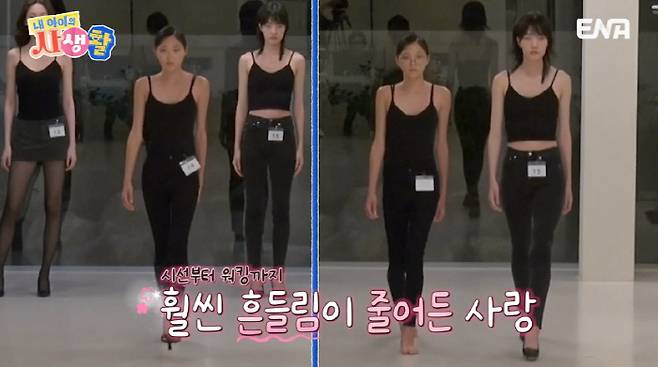 잠시 후 추사랑은 떨리지만 침착하게 모델 눈빛을 장착한 채 워킹을 시작, 프로페셔널한 모습에 엄마도 깜짝 놀랐다. 이현이는 "너무 잘한다"면서 칭찬했다.