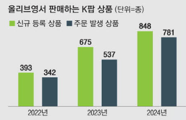 29일 올리브영에 따르면 올리브영의 해외 온라인 플랫폼인 ‘올리브영 글로벌몰’에서 작년 상반기 대비 올해 상반기(6월 27일 기준) K팝 카테고리 매출이 240%나 증가했다. 국내 올리브영 매장에서도 K팝 카테고리 매출이 같은 기간 220% 는 것으로 집계됐다. 현재 K팝 관련 상품을 판매하는 매장은 명동역점, 명동타운, 올리브영N 성수, 홍대 놀이터점까지 총 4곳이다.