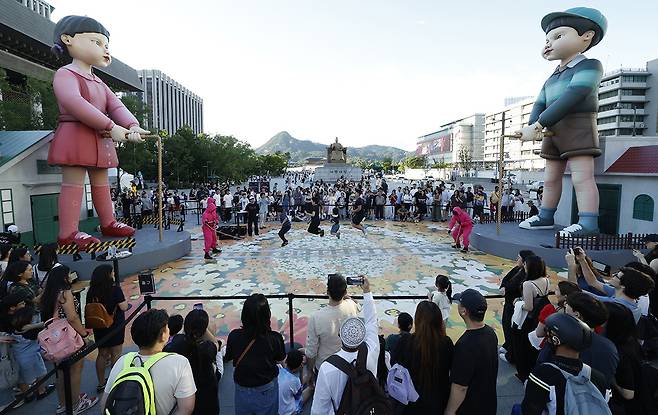 서울시는 다음달 6일까지 광화문광장에서 넷플릭스와 함께 '오징어 게임' 속 한국 전통놀이를 즐기는 '팝업 광화문'과 K콘텐츠와 함께 볼거리·먹을거리 정보를 안내하는 '소울스팟 여행안내소' 부스를 운영한다.