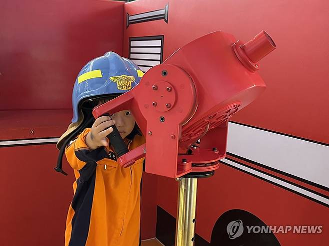 (서울=연합뉴스) 한 아이가 29일 서울 용산구 용산어린이정원 보보의 집에서 소방관 체험을 하고 있다. 2025.6.29 [국가보훈부 제공. 재판매 및 DB 금지]