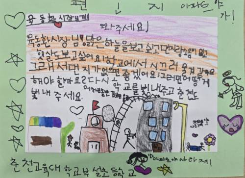 춘천교대부설초등학교 학생들이 학교 앞 고층건물 건립에 대한 우려를 담은 그림편지를 김진태 강원특별자치도지사와 육동한 춘천시장에게 작성해 화제다.