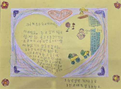 춘천교대부설초등학교 학생들이 학교 앞 고층건물 건립에 대한 우려를 담은 그림편지를 김진태 강원특별자치도지사와 육동한 춘천시장에게 작성해 화제다. 두 기관장 모두 이 학교 출신이라는 점에서 더욱 주목된다.