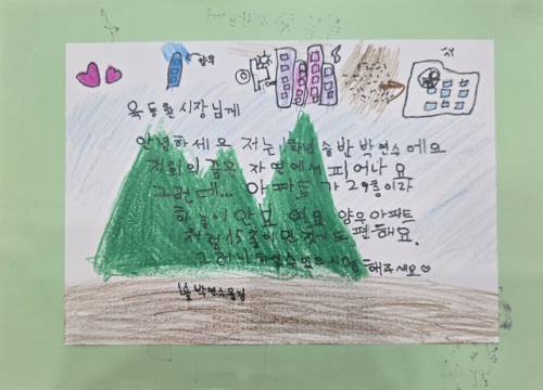 학생들은 편지를 통해 "햇빛을 받고 싶어요", "새 소리 사라질까 무서워요", "건물을 15층으로 해주세요", "아파트야 가!" 등 아이다운 귀여운 바람을 담았다.