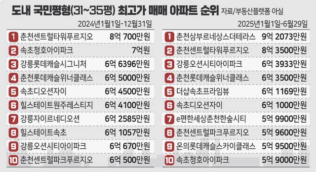 국민평형(31~35평) 기준으로도 속초청호아이파크(34평)가 지난해 7억원에 거래돼 도내 최고가 아파트 순위 2위를 차지했으나 올해는 5억9000만원에 거래되며 10위로 내려앉았다. 지난해 6억4500만원에 거래됐던 속초디오션자이는 올해 6억1000만원에 거래되는 등 하락세를 보였다. 같은 아파트 같은 평형이라도 층수나 위치 등에 가격변동이 있지만 최근에는 그 차이가 심화됐다.
