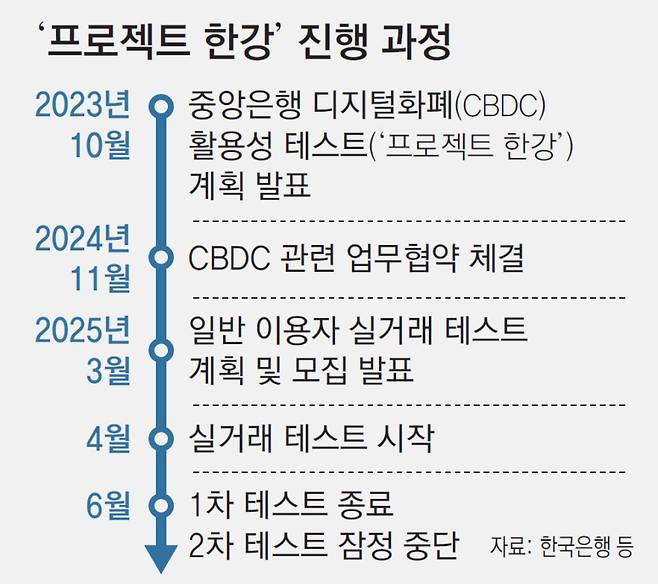 한국은행이 추진하던 중앙은행 디지털화폐(CBDC) 실험 '프로젝트 한강'이 2차 테스트를 앞두고 멈춰섰다.