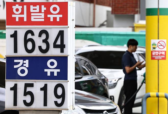 29일 서울 시내의 한 주유소에 기름값이 표시돼 있다. 한국석유공사 유가정보 사이트 오피넷에 따르면 6월 넷째 주 전국 주유소의 휘발유 평균 판매 가격은 L당 1663.2원으로 집계됐다. 전주보다 27.7원 오르며 2주 연속 상승세를 이어갔다. 경유 판매 가격도 L당 1527.2원으로, 일주일 전보다 29원 오르며 2주째 뛰었다.