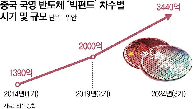 빅펀드3는 지난해 출범한 제3차 국가직접회로 사업투자펀드(ICF)로 중국 정부가 조성한 세 번째 반도체 육성 기금이다. 중국은 2014년부터 5년 단위로 빅펀드1(2014∼2018년), 빅펀드2(2019∼2023년)를 만들어 운영했다. 각각 1390억 위안, 2000억 위안으로 3차 펀드는 기존의 두 펀드를 합친 것보다 큰 규모다.