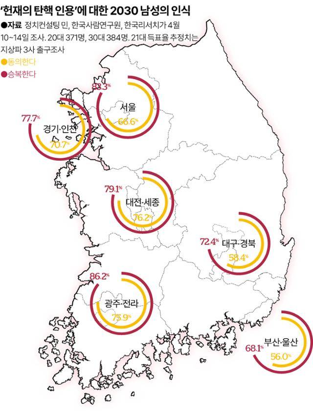 윤석열 전 대통령을 ‘아버지’라 부르는 일부 대학생들의 행태는, 보수 진영 내부에서 ‘극우’가 하나의 정체성으로 새롭게 부상하고 있음을 보여준다. 관건은 잠재적 대중 기반이다. 지난 4월 정치컨설팅 민과 한국사람연구원이 한국리서치에 의뢰해 실시한 조사에 따르면, 부산·울산·경남 등 제조업이 흔들리는 지역에서 윤 전 대통령에 대한 지지가 뚜렷했다. 부울경 20~30대 남성 중 “헌법재판소의 윤 전 대통령 탄핵 인용에 동의한다”는 응답은 56.0%로, 보수 성향이 강한 대구·경북(58.4%)보다도 낮았다.