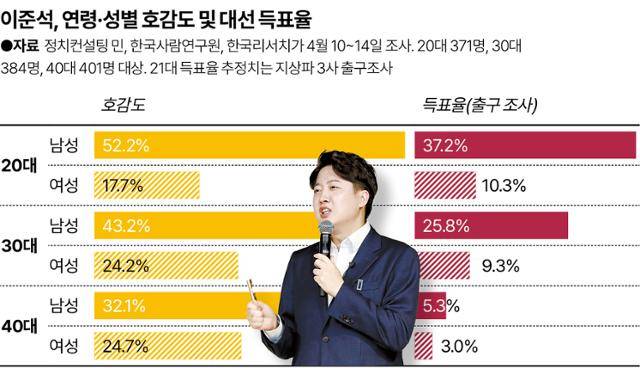 20~30대 여성의 10%가량(20대 10.3%, 30대 9.3%)이 이준석 후보를 지지한 것은 일종의 ‘비판적 지지’다. 지난 4월 민 컨설팅과 한국사람연구원의 대선 후보별 호감도 조사에 따르면, 이준석 후보에 호감을 느낀다고 응답한 비율은 여성 20대 17.7%, 30대 24.2%에 불과했다. 이런 양상은 경제적으로는 보수 성향이지만 국민의힘에는 손을 내밀지 않는 ‘자유주의-보수성향 여성’이 증가했기 때문이다. 같은 조사에서 ‘경쟁을 중시하는 사회가 돼야 한다’는 취지의 물음에 30대 여성 정규직은 46.0%가 동의한 반면, 같은 연령대 비정규직·자영업자·비경제활동 여성에서는 26.2%만 동의했다. 여성의 경제적·사회적 지위가 개선되면서, 중상층 여성 일부가 보수 가치에 이끌리고 있는 것이다.