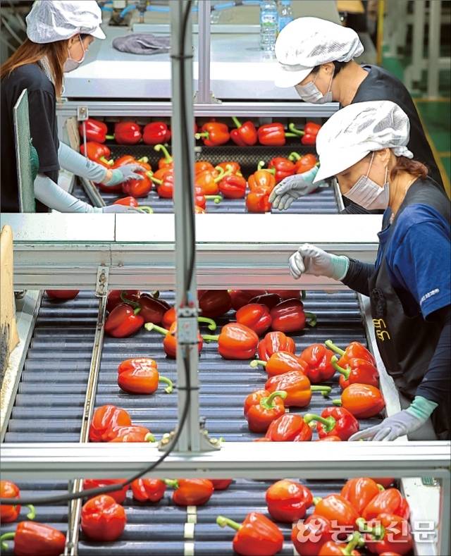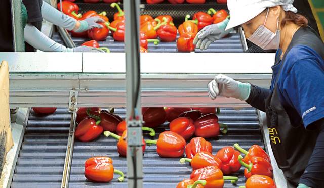 27일 강원 철원에 있는 농업회사법인 ‘조은그린’에서 수출용 파프리카 선별작업이 한창이다. 중남부 지역에선 대개 여름을 피해 파프리카를 생산하지만 철원은 6∼11월이 제철이다.