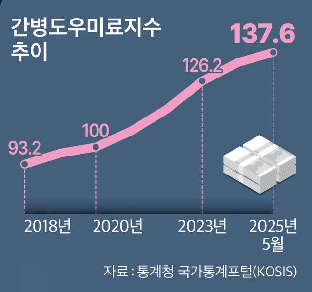 한국은행에 따르면 2023년 기준 월평균 간병비는 370만원에 달한다. 이는 65세 이상 고령가구 월 중위소득의 1.7배 수준이다. 간병비도 해마다 오름세다. 지난달 간병도우미료지수는 137.6(2020=100)으로, 2020년 대비 37.6% 올랐다. 국민건강보험이나 장기요양보험으로 일부 보장이 가능하지만, 민간 간병보험이 주목받는 이유다.