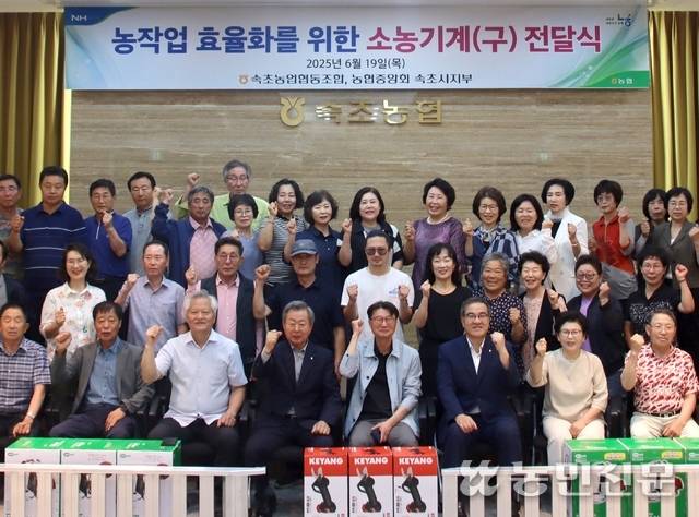강원 속초농협(조합장 최원규)이 19일 NH농협 속초시지부(지부장 탁승열)와 함께 하나로마트 엑스포점에서 ‘2025년 농작업 효율화를 위한 소농기계 전달식’을 열었다(사진).