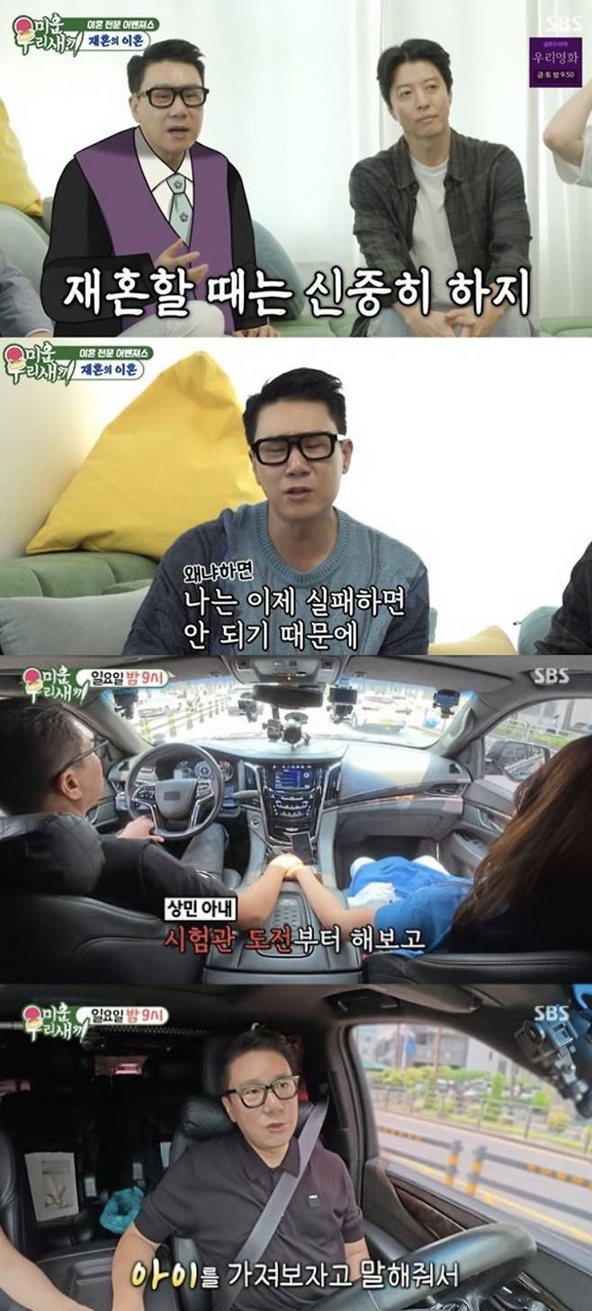 이상민은 "사실 재혼 마음을 먹기가 쉽지 않다. 최악을 생각해야 한다. 저도 그랬다. 재혼하기 전에 어떤 실수도 반복하지 않기 위해 고민을 많이 하고 아내에게 성격 생활습관 과거까지 많이 설명하고 알려줬다. 아내가 이제 그만 말해도 된다고 나를 사랑하니까 결혼하는 거라고 하더라"라고 털어놨다.