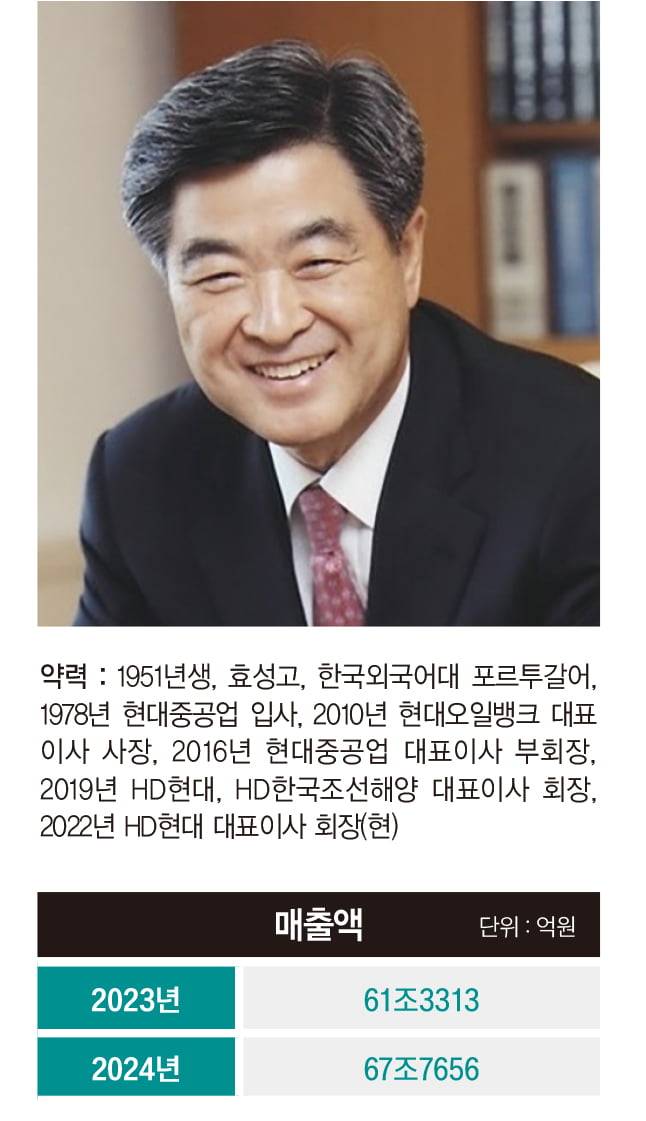 2019년 11월 HD현대 회장으로 취임한 이후 조선 중심의 사업구조에서 벗어나 사업 포트폴리오 다각화를 통한 안정적인 수익구조 확보에 나섰다. 2021년 8월 HD현대인프라코어를 인수, 조선·건설기계·에너지 등 3대 핵심축으로 이뤄진 사업 포트폴리오를 구축했고, 이는 HD현대가 신사업 진출과 사업 확장에 더욱 속도를 낼 수 있는 기반이 됐다.