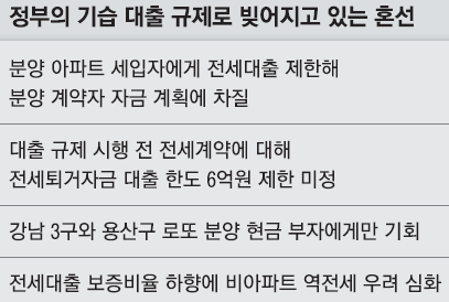 올해 서울 대단지 아파트 입주를 앞둔 한 수분양자는 “2년 전 분양 시점엔 정부가 소유권 이전 전세대출을 금지할 것이라고는 상상하지도 못 했다”며 “이번 대출 규제로 분양 잔금을 내지 못하면 정부가 책임져줄 것도 아니지 않느냐”며 강한 불만을 드러냈다.