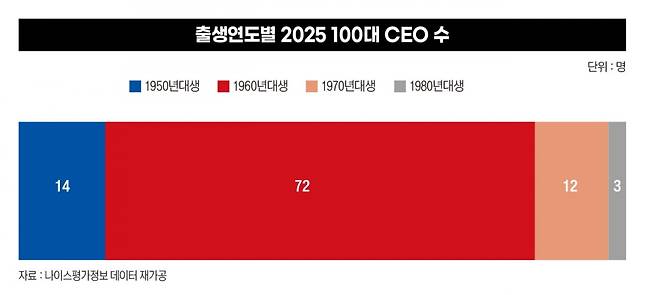 전년과 비교하면 100대 CEO의 구성은 크게 달라지지 않았다. 지난해에는 1964년생이 평균을 차지했고 이들을 포함한 1960년대생은 총 75명이었다. 올해는 60년대생이 이보다 적은 72명을 차지한 가운데 1950년대생도 소폭 줄었다.