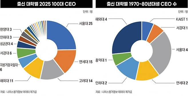 지거국과 SKY가 빠진 자리는 해외 대학 출신들이 메우고 있다. 100대 CEO 전체에서 11%(11명)였던 해외대 비중이 1970~1980년대 15명 중에서는 서울대와 같은 26.7%(4명)로 늘었다. 주로 오너 3~4세들이 여기 속한다. 명문 학벌을 중시하던 옛 분위기에서 점차 글로벌 감각을 익히게 하는 쪽으로 바뀐 재계의 교육 방침이 일찍 3~4세 승계에 나선 기업에서 나타나고 있는 것이다.