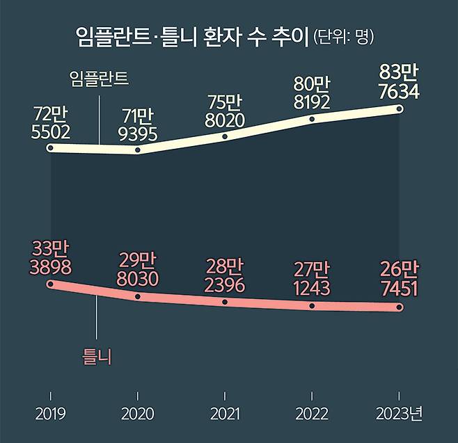 건강보험심사평가원의 ‘국민관심진료행위’ 통계에 따르면, 최근 5년간 임플란트 수술은 꾸준히 증가했다. 2019년 약 72만 건이던 임플란트 수술은 83만여 건으로 늘었다. 반면 틀니 치료는 같은 기간 33만여 건에서 26만여 건으로 줄어들었다.