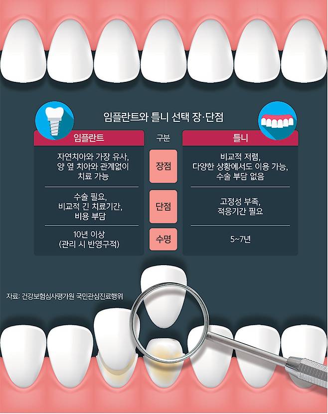 틀니와 임플란트의 선택은 치아 손실 개수, 턱뼈와 잇몸 상태 등에 따라 달라진다. 임플란트는 인공치근을 턱뼈에 심고 그 위에 인공치아를 장착하는 방식인 반면, 틀니는 잇몸 위에 탈부착 가능한 보철물을 올리는 방식이다.