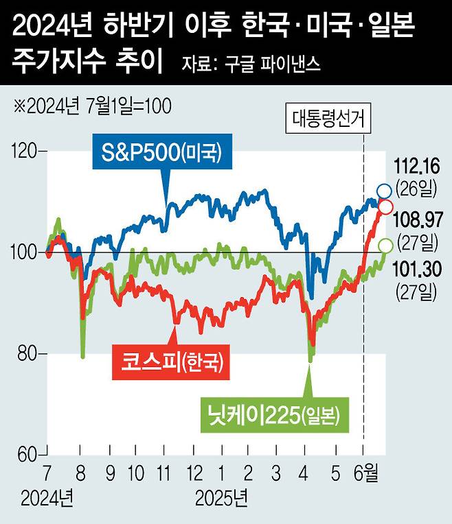 코스피는 4월9일 저점 대비 두 달 반 동안 35% 상승했고, 대선 뒤 3주 동안 15% 넘는 상승률을 기록하며 3100선을 돌파했다.