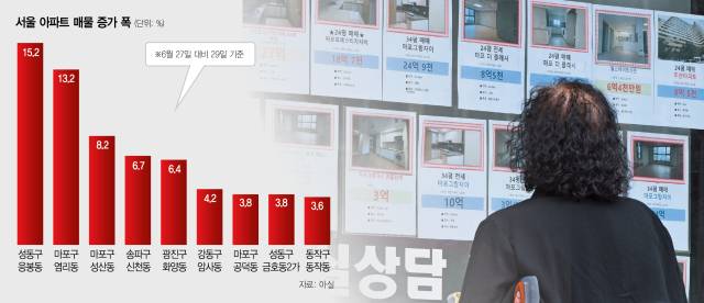 부동산 빅데이터 플랫폼 아실에 따르면 서울 마포·성동·광진·강동구 일대 주요 아파트 매매 매물은 이달 27일 대출 규제 발표를 기점으로 증가했다. 지역별로 보면 성동구 응봉동 매물이 이틀간 59건에서 68건(15.2%)으로 가장 많이 늘었고 마포구 염리동(13.2%)·성산동(8.2%), 광진구 화양동(6.4%), 강동구 암사동(4.2%) 등도 매물이 증가세로 돌아섰다. 성동구 B 공인중개업소 관계자는 “3단계 스트레스 총부채원리금상환비율(DSR) 시행 전 막차 매수가 거의 끝나가면서 지난주부터 매물 감소가 멈추는 분위기였다”며 “집주인들이 집을 다시 내놓을까 고민하고 있어 다음 주면 매물이 눈에 띄게 늘어날 것”이라고 말했다.