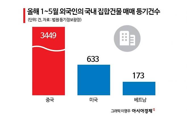 법원 등기정보광장에 따르면 올해 1월부터 5월까지 외국인이 신청한 아파트·오피스텔 등 집합건물 소유권 이전(매매) 등기는 총 5153건으로 집계됐다. 국적별로는 중국인이 3449건(66.9%)으로 가장 많았다. 이어 미국인 633건, 베트남인 173건 등의 순이었다. 고동진 국민의힘 의원과 유용원 국민의힘 의원 등이 외국인 부동산 매입과 관련한 규제 내용을 담은 법안을 최근 발의했지만 실제 통과는 불투명하다.