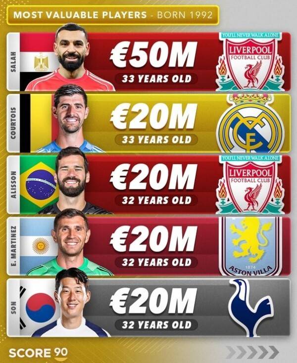 1992년생 1위는 리버풀의 모하메드 살라로, 시장 가치는 5,000만 유로(약 800억 원)에 달했다. 손흥민은 티보 쿠르투아, 알리송, 에밀리아노 마르티네스와 함께 2,000만 유로(약 319억 원)의 평가를 받아 공동 2위에 올랐다.