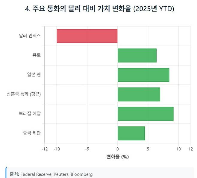 핌코는 신흥국 통화 채권에서도 사상 최대의 자금이 유입됐다고 분석하기도 했다. 글로벌 투자자들이 달러 약세에 베팅하고 있다고 분석이다. 올해 들어 달러 가치를 보여주는 지표인 달러인덱스는 10% 하락했고 주요 신흥국 통화는 7% 정도 절상되는 등 통화 흐름도 바뀌었다.