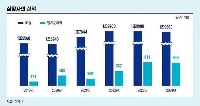 삼양그룹 매출의 38%, 순이익의 41%가 삼양사에서 나와요. 또 페트병을 제조하는 삼양패키징, 세제의 원료인 계면활성제를 생산하는 삼양케이씨아이도 자회사로 두고 있어요.