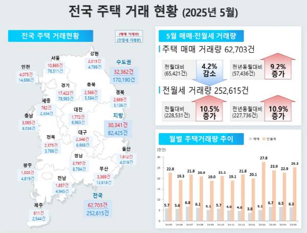 한편 5월의 부산지역 전체 주택 인허가 실적은 759가구였다. 1~5월 누적 수치는 9707가구로 전년 동기(1만265가구)에 비해 5.4% 감소했다. 공동주택 분양 물량은 728가구로 조사됐다. 전체 주택 착공 물량은 1095가구, 준공 물량은 1837가구였다. 또 5월에는 3369건의 주택 매매가 진행됐다. 전월(3277)보다 2.8%, 지난해 같은 기간(3349건)에 비해 0.6% 각각 늘었다. 5월의 전월세 거래량은 1만3818건으로 4월(1만3185건) 및 전년 동기(1만2557건)와 비교할 때 각각 4.8%, 10.0% 증가했다.