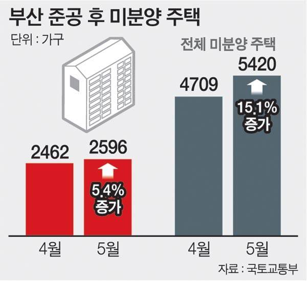 공사가 끝난 이후에도 팔리지 않아 악성으로 분류되는 부산지역의 ‘준공 후 미분양 주택’ 물량이 3개월 연속해서 최다 기록을 바꿨다. 전체 미분양 주택은 7개월 만에 5000가구를 넘어섰다. 정부가 지방의 미분양 주택 급증 해소를 위해 다양한 정책을 내놓고 있지만 좀처럼 개선 신호가 나타나지 않고 있다.