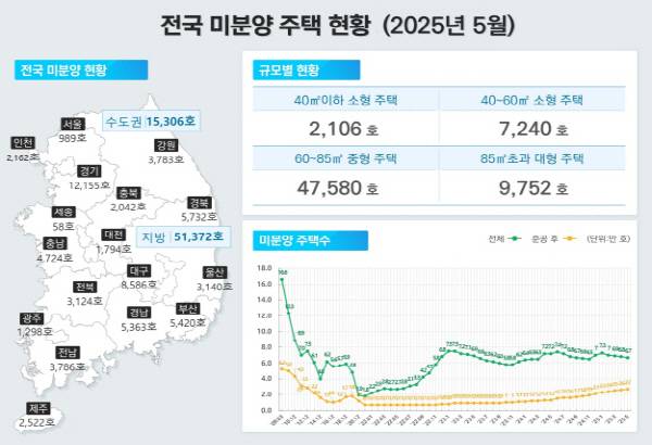 다른 곳의 상황도 부산지역과 다르지 않았다. 5월 전국의 준공 후 미분양 주택은 2만7013가구로 전월(2만6422가구)보다 2.2% 증가했다. 2013년 6월(2만7194가구) 이후 11년 11개월 만에 가장 많은 수치다. 또 2023년 8월부터 22개월 연속 증가세를 이어가고 있으며 지난해 12월 이후 여섯 달 계속해서 2만 가구를 넘었다. 지역별로는 비수도권(2만2397가구)이 수도권(4616가구)에 비해 압도적으로 많았다. 전국의 5월 미분양 주택은 4월(6만7793가구)보다 1.6% 줄어든 6만6678가구로 파악됐다.