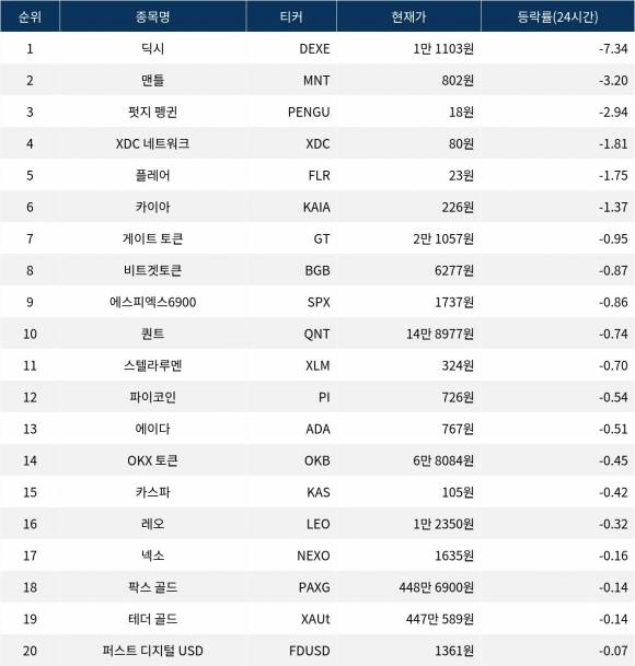 글로벌 가상자산 시황 중계 사이트 코인마켓캡(CoinMarketCap)에 따르면, 딕시(DEXE)가 24시간 동안 7.34% 하락하며 가장 큰 하락폭을 기록했다.