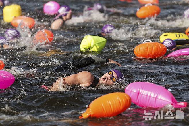 [키이우=AP/뉴시스] 29일(현지 시간) 우크라이나 키이우 드니프로강에서 열린 5㎞ 수영 대회 '오션맨 키이우'(Oceanman Kyiv)' 참가 남성이 힘차게 수영하고 있다. 2025.06.30.