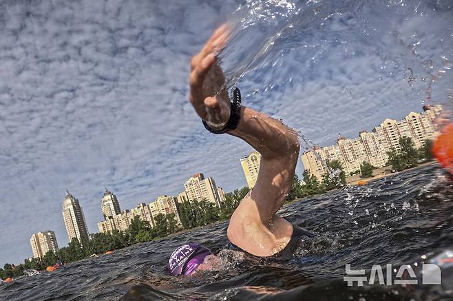 [키이우=AP/뉴시스] 29일(현지 시간) 우크라이나 키이우 드니프로강에서 열린 5㎞ 수영 대회 '오션맨 키이우'(Oceanman Kyiv)' 참가 남성이 힘차게 수영하고 있다. 2025.06.30.