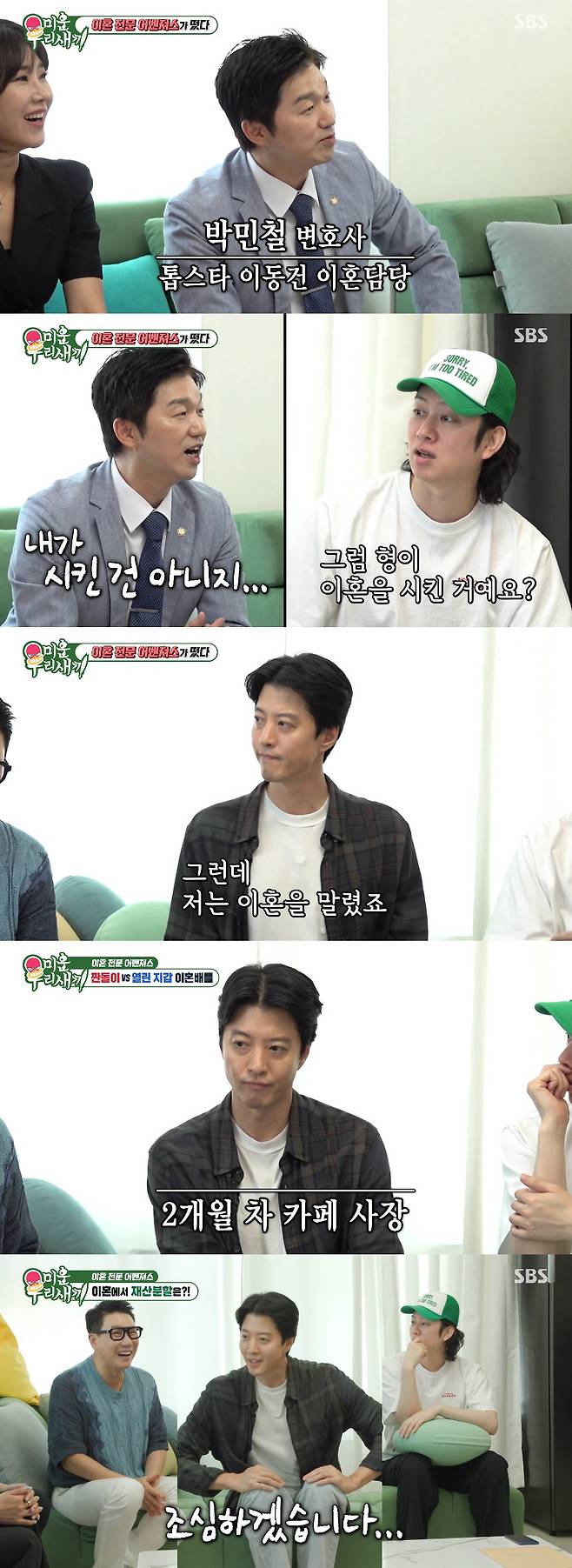 김희철은 "형이 (이동건) 이혼시킨 거냐. 못된 사람이다"라며 몰아갔고, 박민철은 "시킨 게 아니다. 동건이가 가정생활을 유지하는 데 있어서 서로 다른 면이 있었다. 근데 난 이혼을 말렸다. 말린 편이었다. 말린 유일한 사람이 아닐까 싶다"고 밝혔다.