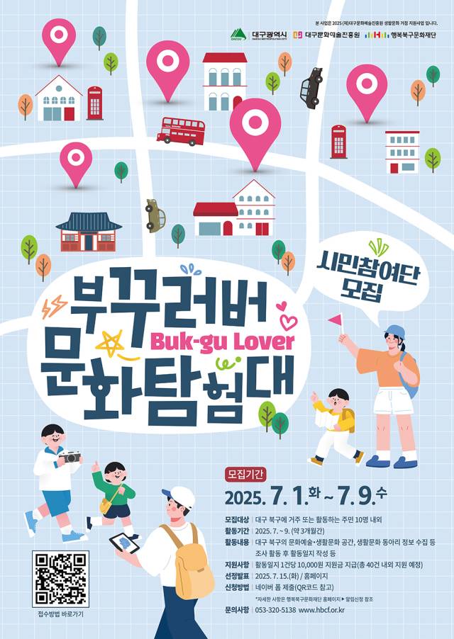 행복북구문화재단이 2025 생활문화 거점 지원사업의 일환으로 대구 북구 생활문화 자원을 직접 조사해 기록하는 시민참여 프로그램 '부꾸러버(Buk-gu Lover) 문화탐험대'에 참여할 주민을 9일(수)까지 모집한다.