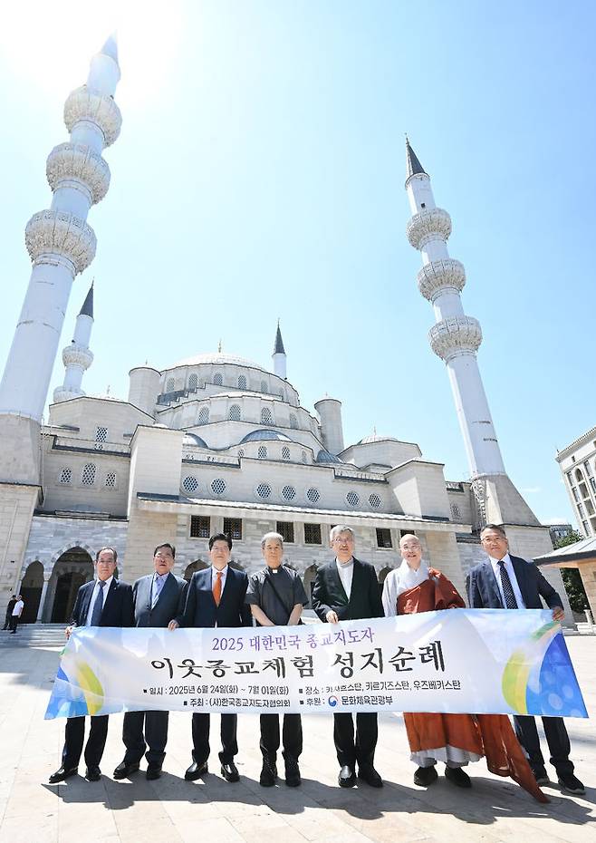 [서울=뉴시스] 카자흐스탄과 키르기스스탄, 우즈베키스탄 등 중앙아시아 3국에서 '이웃종교 체험 성지순례' 중인 한국종교지도자협의회 수장들이 28일 중앙아시아에서 가장 큰 규모의 모스크중 하나인 ‘이맘 사라크시 모스크’를 찾아 기념촬영을 하고 있다.(사진=한국종교지도자협의회 제공) 2025.06.30. photo@newsis.com *재판매 및 DB 금지