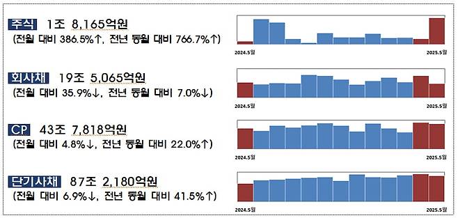 30일 금융감독원이 발표한 '2025년 5월 중 기업의 직접금융 조달실적'에 따르면 기업이 발행한 주식·회사채 공모 발행금액은 21조3230억원으로 집계됐다, 전달 대비 9조4789억원(30.8%) 감소했다.