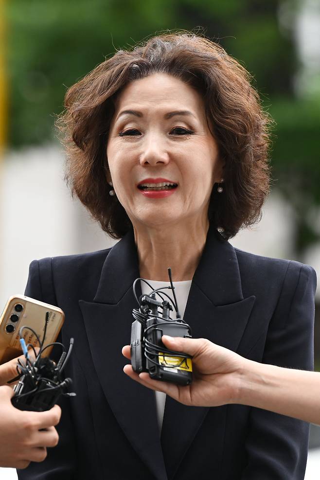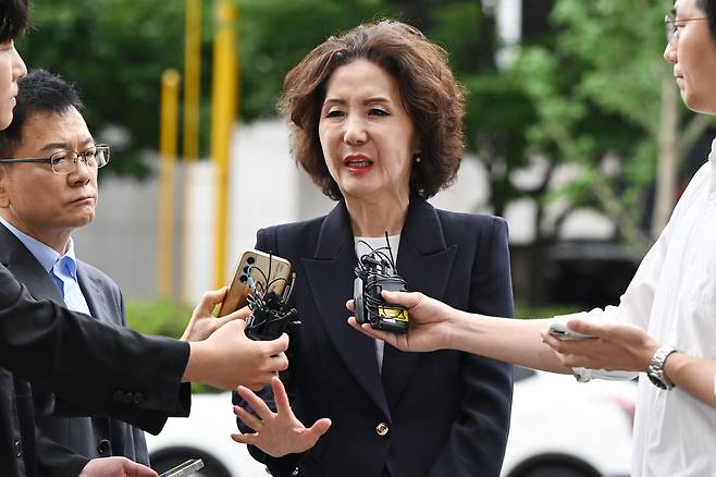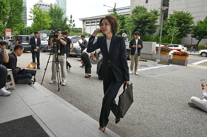교육부장관 후보자로 지명된 이진숙 전 충남대 총장이 30일 서울 영등포구 한국교육시설안전원에서 출근하며 취재진의 질문에 답하고 있다.