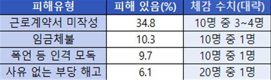 | ▲ [표] 청년 아르바이트생 부당처우 유형별 피해 응답률 ※ 자료: 통계청 ‘2024년 아르바이트 경험 및 부당처우 실태조사’, 기자 재구성 |
