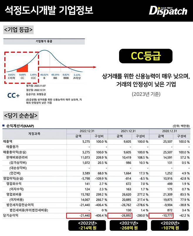 하지만 이창섭의 회사는, 사실상 파산 직전의 상태였다. 기업 정보 조회 사이트(키스라인)에 따르면, 석정도시개발의 신용등급은 CC등급이다. (2023년 기준)